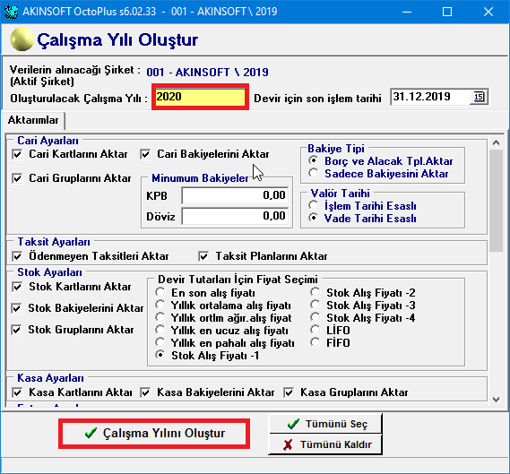 Uyarı 1: AKINSOFT OctoPlus programı 2020 yılına devir işleminden önce son sürümünü güncellemeyi unutmayınız!