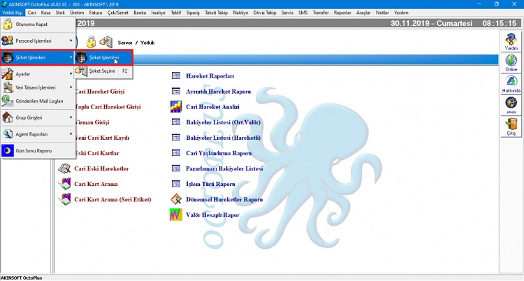 Öncelikle eğer sisteminiz çok kullanıcılı ise, bağlı olan tüm kullanıcıların oturumlarını kapattıklarından emin olunuz. OctoPlus programında devir işlemi için, Server makineden ana menü “Yetkili Kişi” sekmesinden, Şirket İşlemlerine tıklayınız. Karşınıza aşağıda ekran görüntüsü verilen pencere açılacaktır.